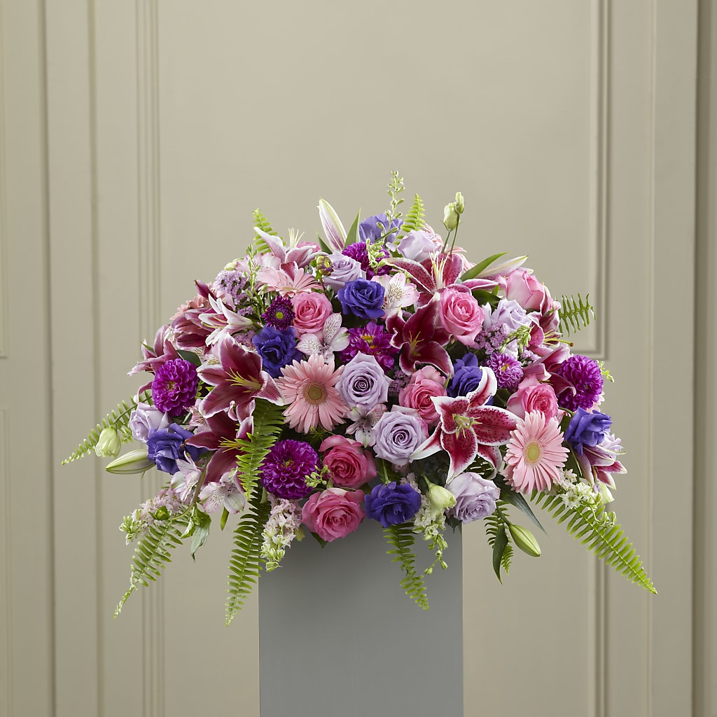 When you’re looking for a special way to celebrate a life and mourn its passing, let this colorful, mixed flower arrangement deliver your sincere expression of love and loss. This lavish display, handcrafted by our artisan designers, includes pink larkspur, gerbera daisies and statice, hot pink and lavender roses, hot pink ball dahlias and oriental lilies, with lush sword fern fronds.